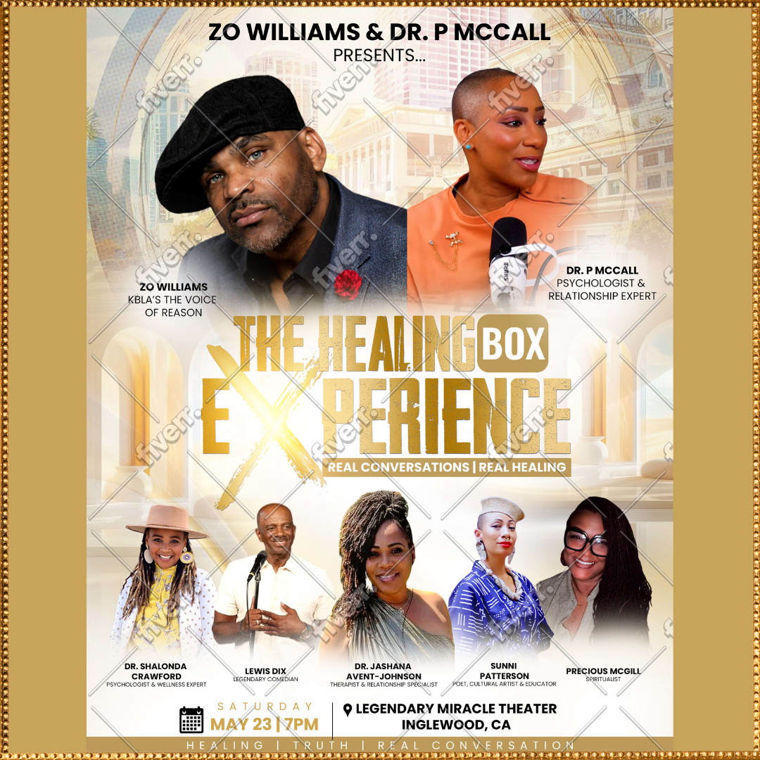 The healing box is the brainchild of Zo Williams The voice of reason on KBLA 1580 and Nsight.me that sucks to heal using different layers and aspects of our community heal from what you say intimate relationship struggles. This event seems to diagnose, disrupt and impart wisdom and perspective to many of the relationship pitfalls we struggle with. A unique ensemble of world, renowned, and respected talent starting with legendary Comedian, Lewis Dix, who brings the fun! Then we move to world, renown spoken word, artist, Sonni Pat Patterson., Who brings the contextual understanding with magical words. Then spiritualist Precious McGill gives multidimensional inner understanding and wisdom. The clinical side is all sewn up by Dr. P. McCall, Dr. Shalonda, Sunshine Crawford, and Dr. Jeshana Avent Johnson Both KBLA 1580 radio personalities